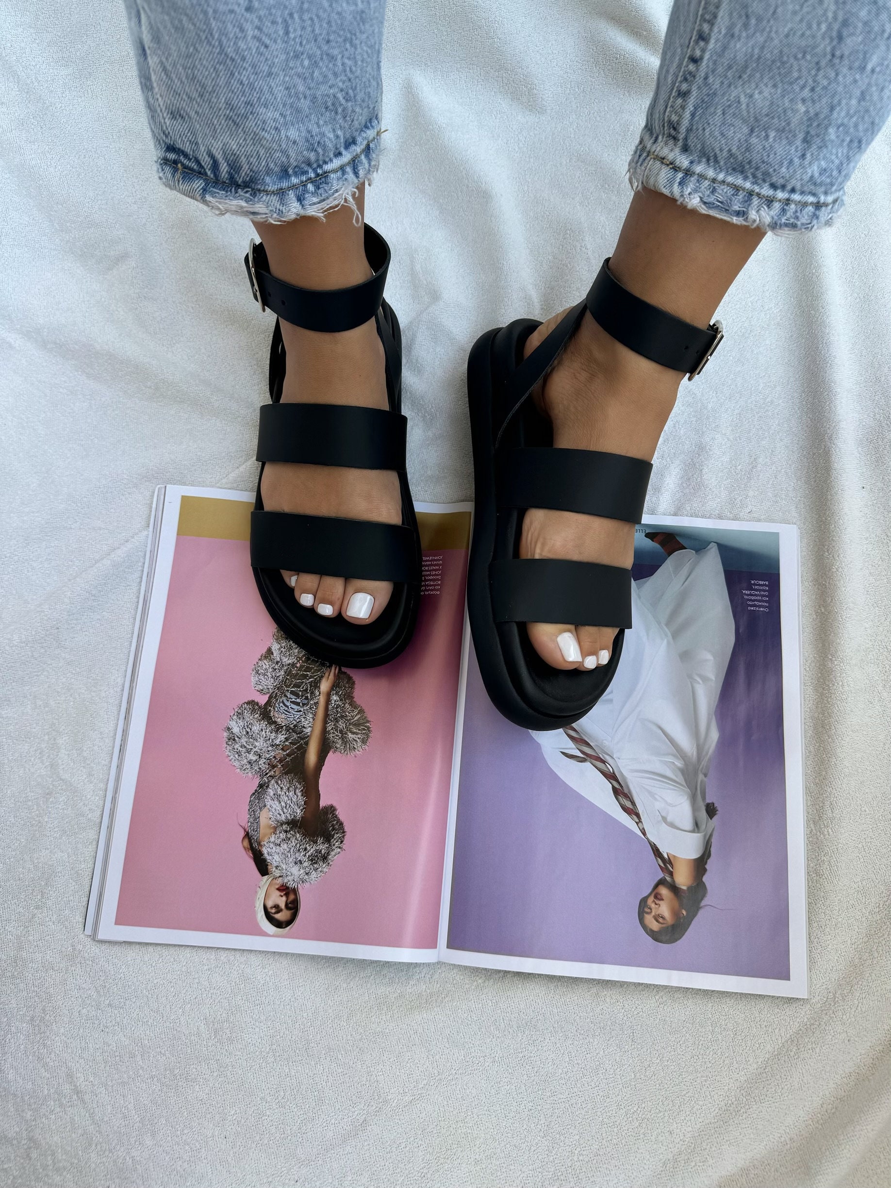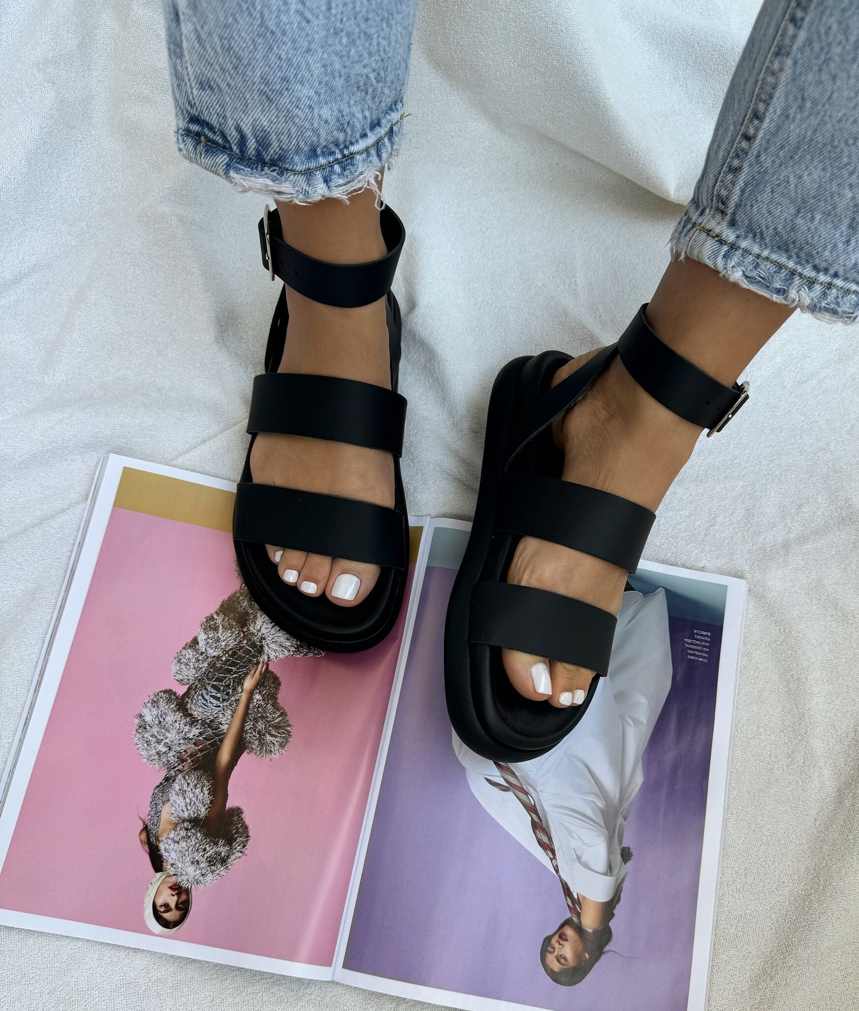 Black Leather Flat Sandals Women Platforms Wedges Greek
